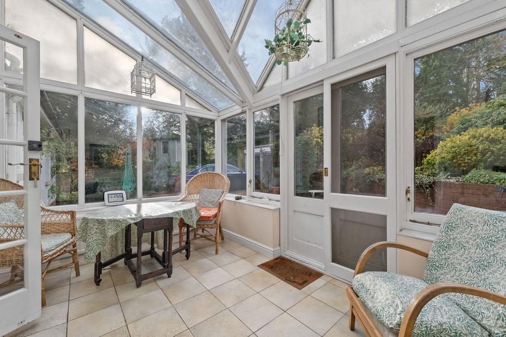 A bright and inviting conservatory enjoying a peaceful outlook across the beautifully planted rear courtyard garden. With a pitched glazed roof and windows on three sides, the room is filled with natural light throughout the day, making it an ideal spot for relaxing, dining, or enjoying the garden in all seasons.