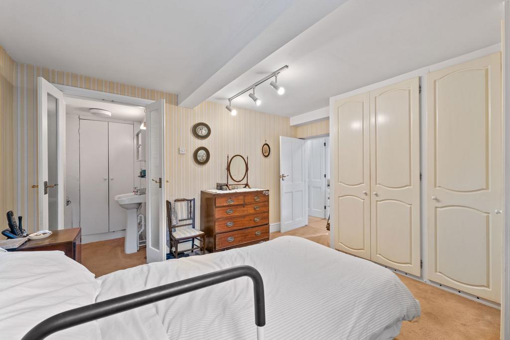 A well-proportioned double bedroom positioned on the split-level upper floor, offering a peaceful and private retreat within the home. The room enjoys a pleasant outlook through a sash window and features extensive fitted wardrobes providing generous built-in storage.