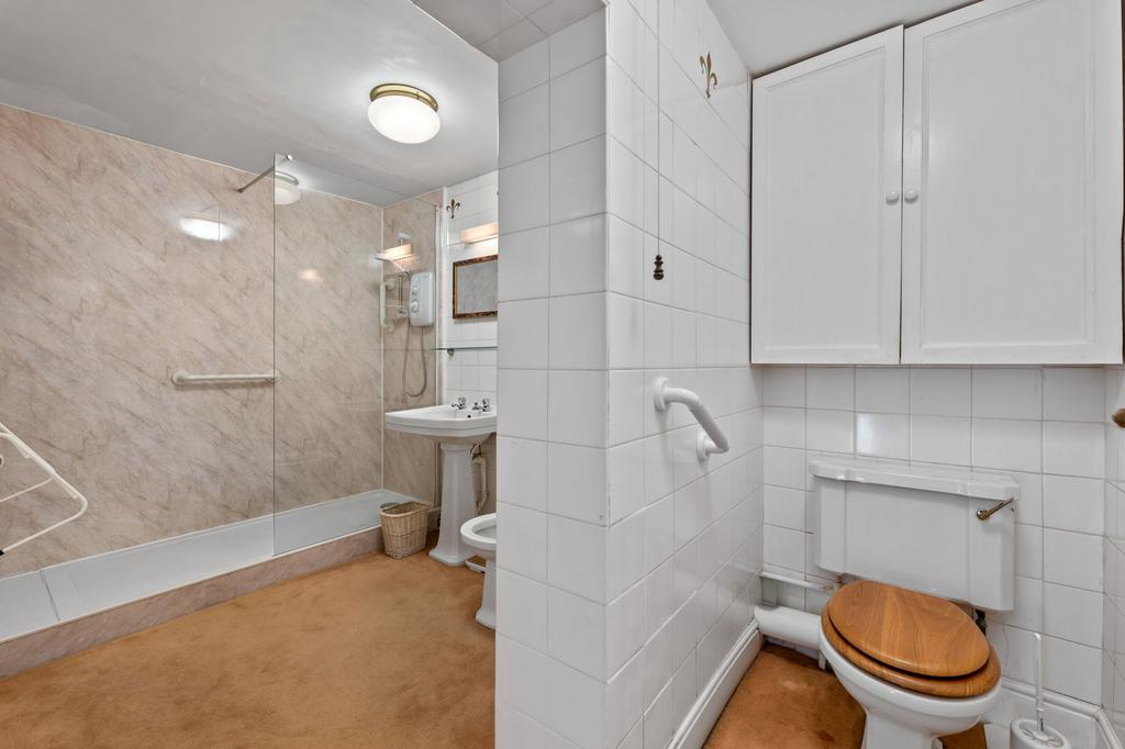 A spacious bathroom positioned on the upper split level, accessed directly from the landing rather than through the bedroom. The room features a large walk-in shower area with screen, pedestal wash basin and WC, along with fitted storage cupboards. Finished in a traditional style and currently carpeted, the bathroom offers excellent scope for modernisation to create a contemporary family or principal bathroom. The generous proportions provide plenty of potential for reconfiguration if desired.