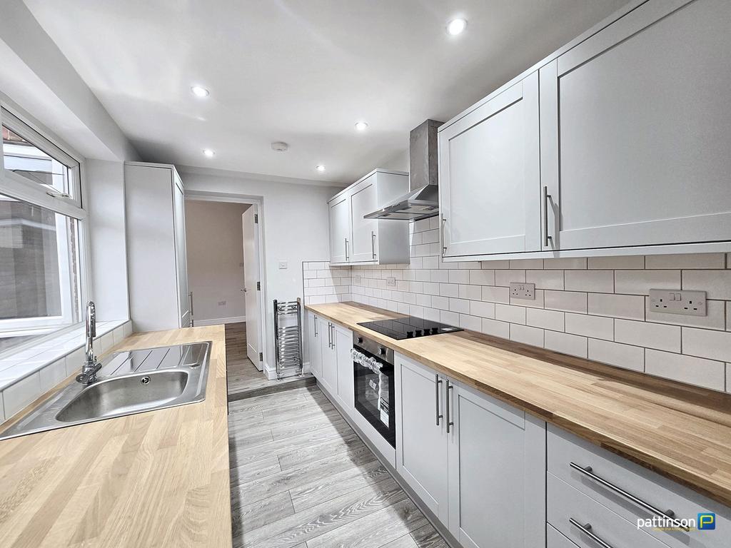 Newly fitted modern kitchen with a range of wall and base units, worktops, and tiled splashbacks. Integrated oven and hob with extractor. Rear window and access door leading to the ground floor shower room.