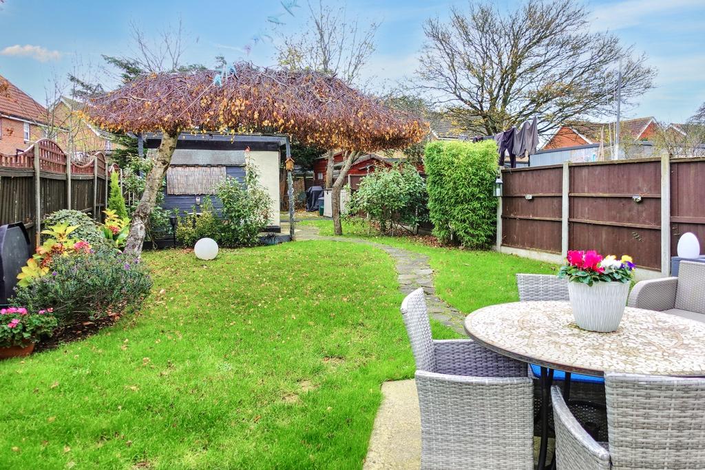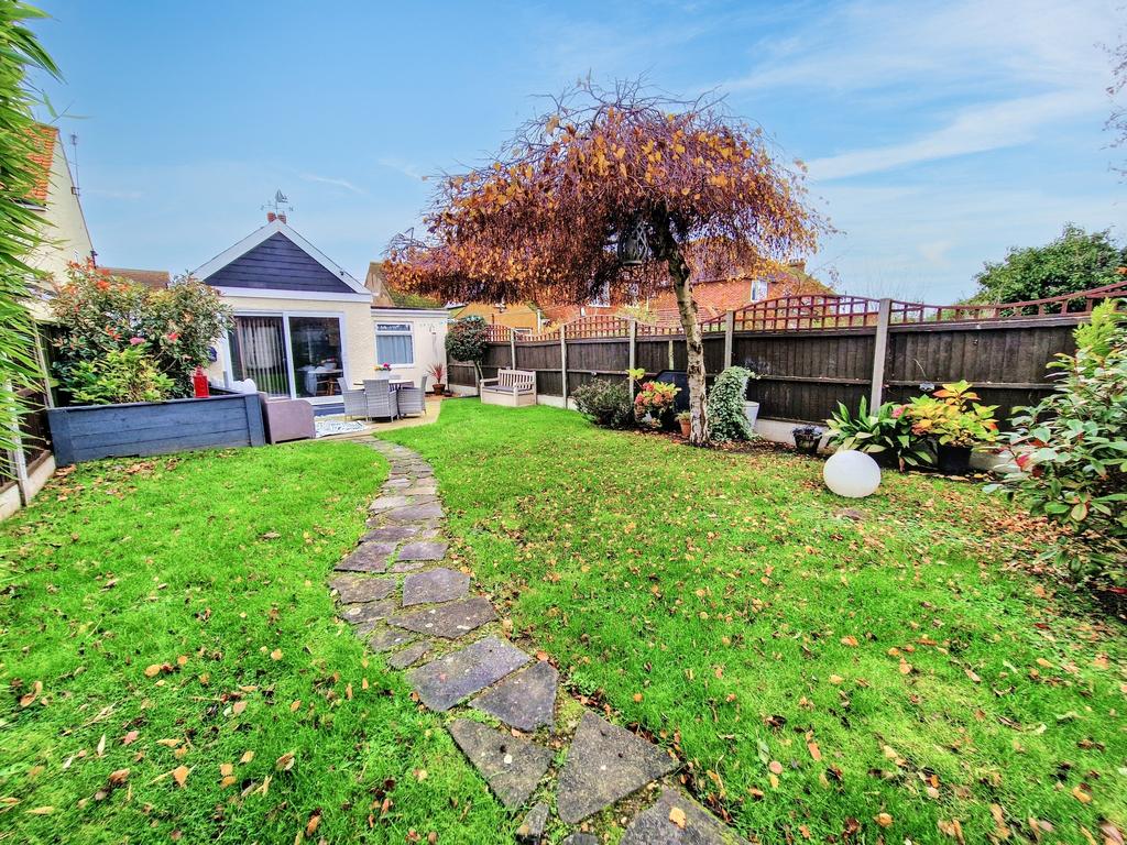 At the heart of the home sits a fully fitted kitchen, perfect for culinary enthusiasts. Patio doors open onto a generous, mature rear garden, creating a seamless blend of indoor and outdoor living and offering the perfect backdrop for summer gatherings or a quiet morning coffee. The garden also benefits from a spacious garage, ideal for storage or hobby space, complemented by a private driveway offering convenient off-road parking.