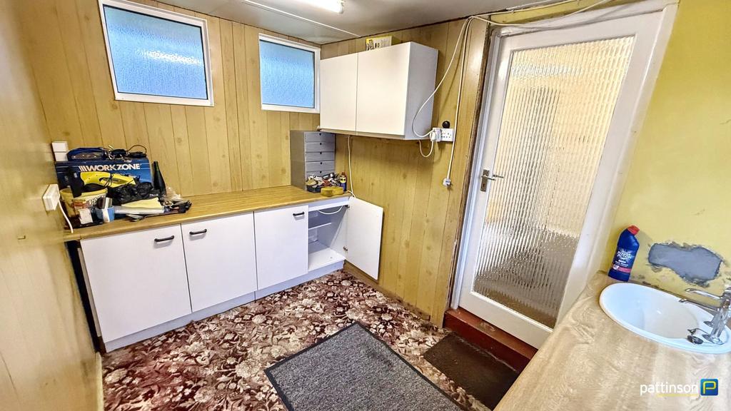 Window to rear, two windows to front and access door into the rear garden. Fitted wall and base units with laminate worktops, bowl sink, plumbing for washing machine.