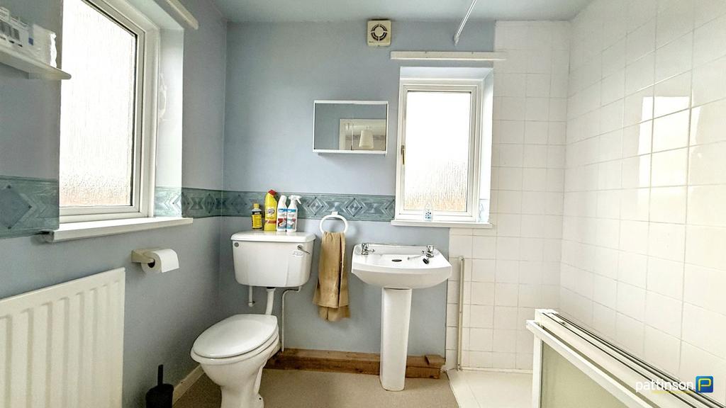 Frosted windows to rear and side. Walk in shower area with tiled splashbacks, pedestal wash hand basin, w.c, radiator.