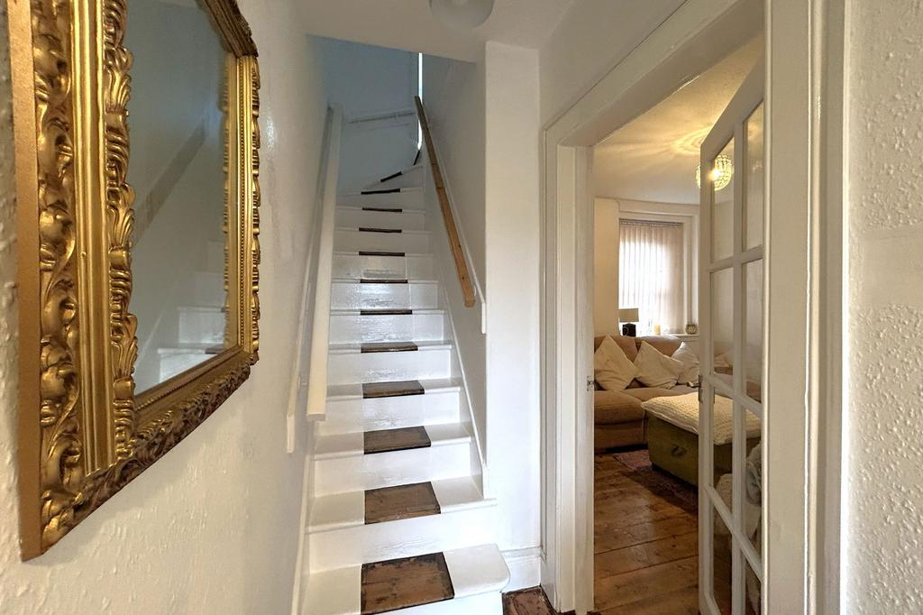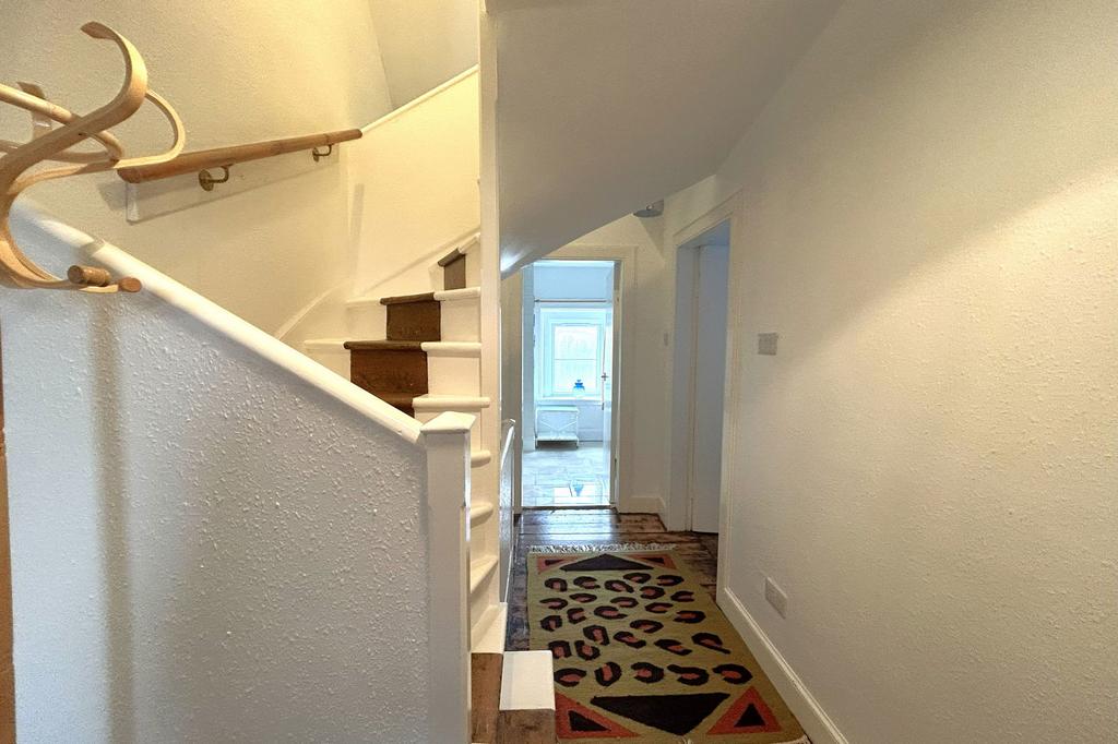 The front door leads into the porch and then the hallway with stairs to the first and second floor and the lounge on the ground floor.