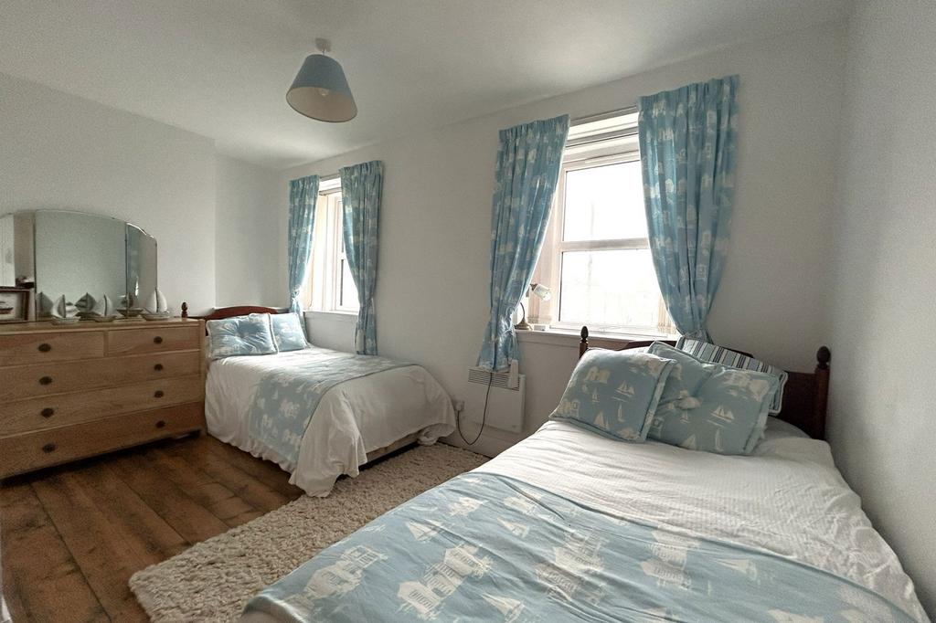 A bedroom to the rear of the property. Wooden floor.