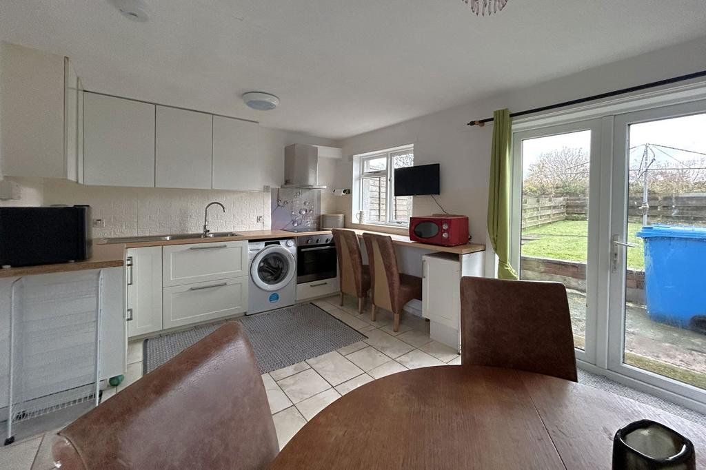 The kitchen/diner has fitted base and wall unit with integrated hob, oven and hood, free standing washing machine and fridge/freezer included. Tiled floor and ample space for table & chairs. Dual aspect windows and French doors lead to the rear garden.