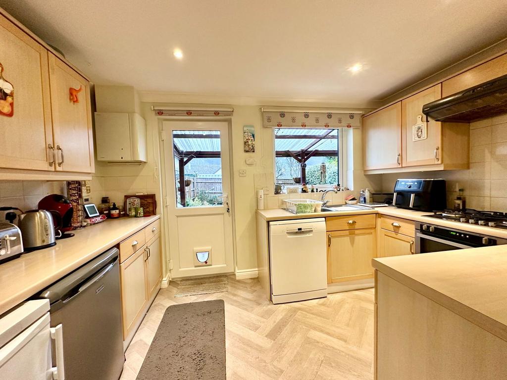 Coved ceiling with inset spotlights, UPVC double glazed window to rear aspect. Fitted kitchen comprising a range of base and drawer units with roll edged work surfaces over, inset 1.5 bowl sink and drainer with mixer tap over, inset four ring gas hob with extractor over, tiled surrounds, matching eyelevel cabinets, space for dishwasher, space for under worktop fridge and freezer, built-in double electric oven, UPVC double glazed door opening onto the rear garden.