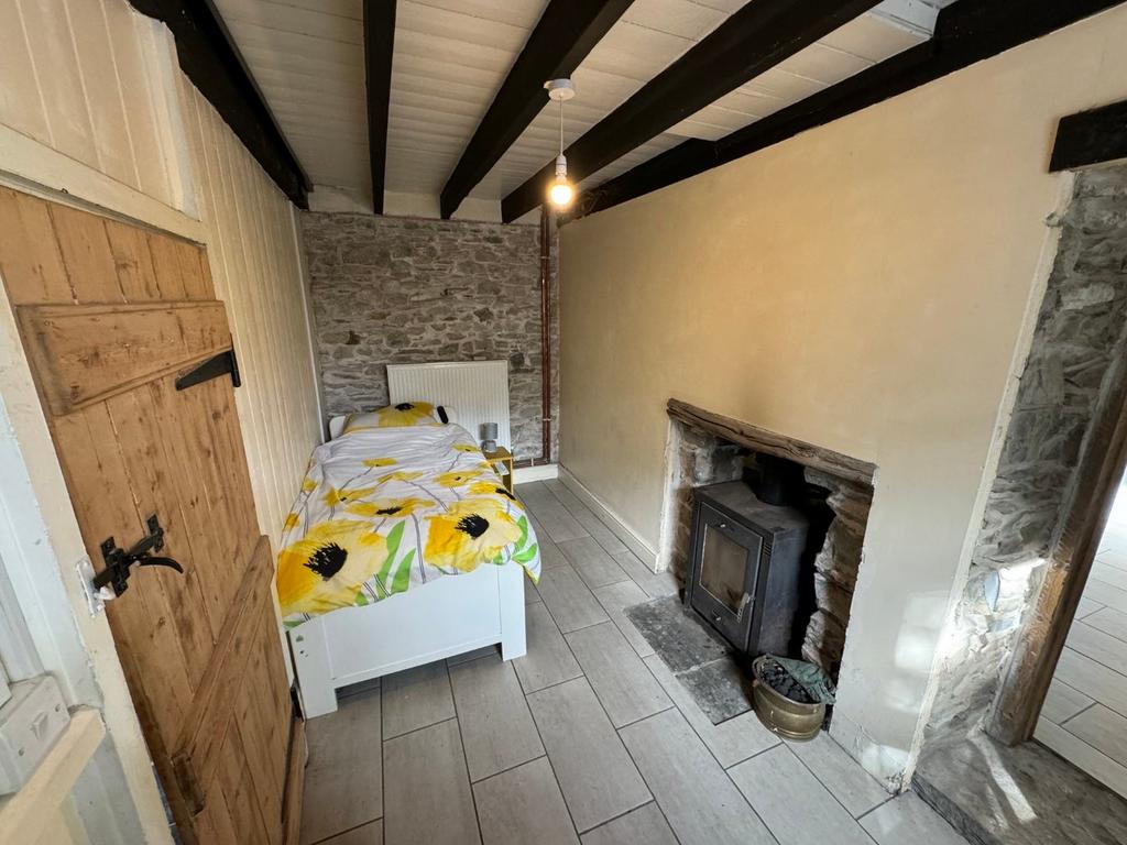 7' 1" x 18' 1" (2.16m x 5.51m) double bedroom, window to front, radiator, tiled flooring, log burner on slate hearth, connecting door into: