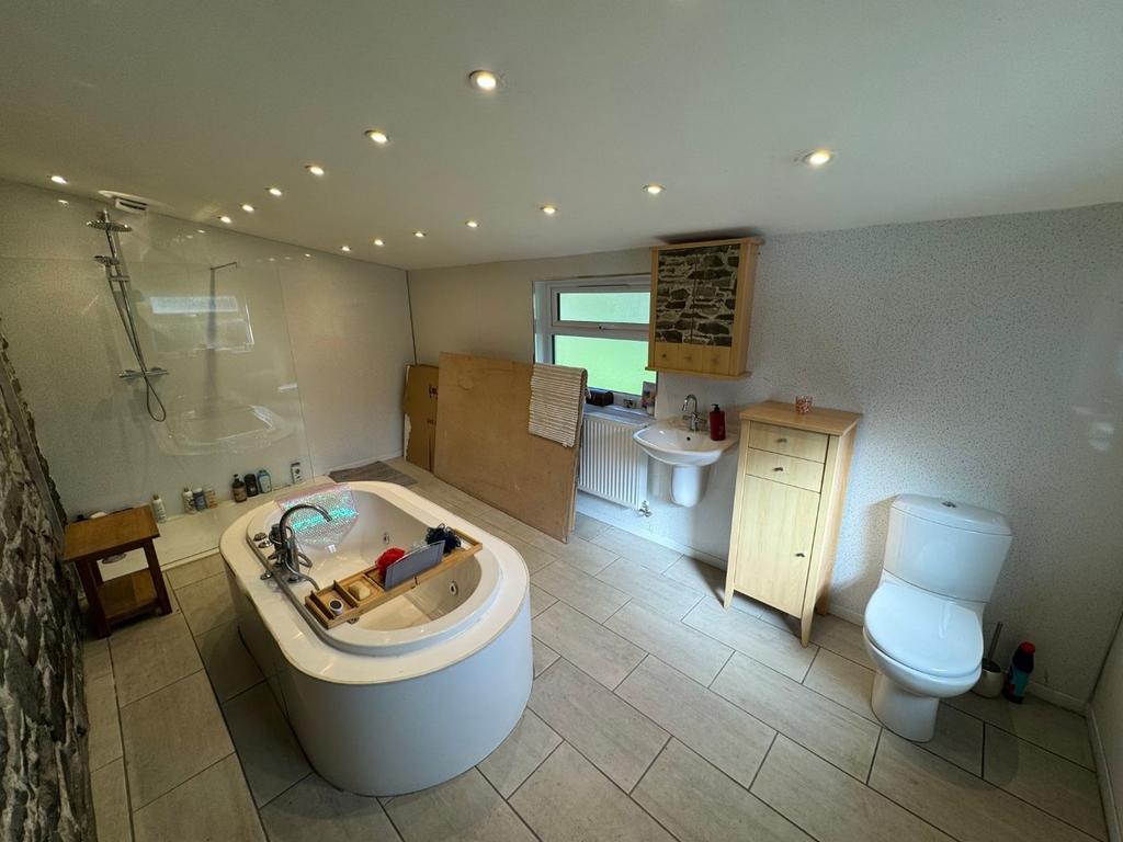 7' 1" x 6' 9" (2.16m x 2.06m) with plumbing for washing machine, WC, Belfast sink with mixer tap, side window, fully exposed stone walls, heated towel rail, tiled flooring.