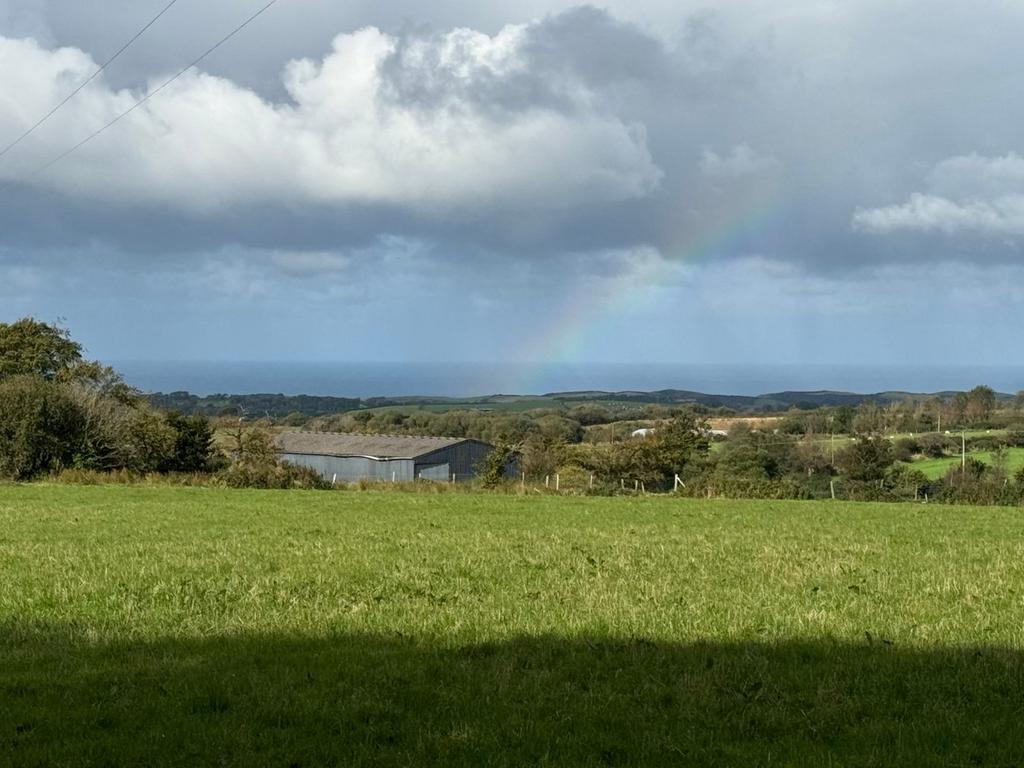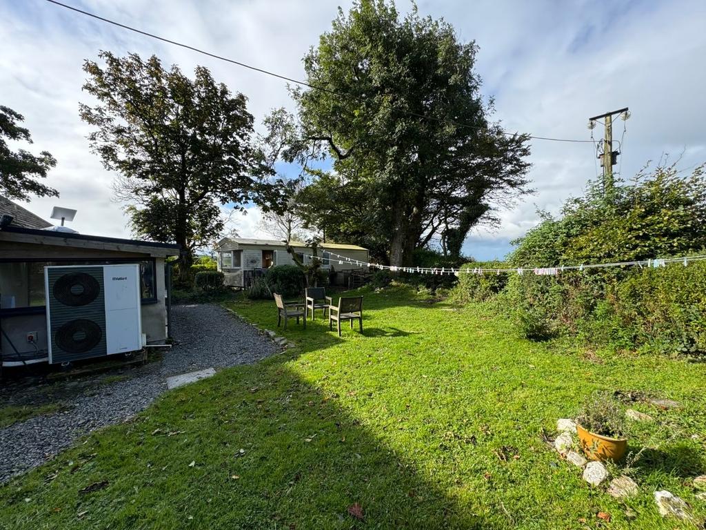 Front and rear garden area predominantly laid to lawn with distant sea views to the coast, side static caravan used for storage purposes