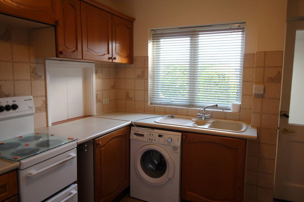 A range of wall and base units and drawers with worktops over, sink and drainer with mixer tap, plumbing and space for automatic washing machine, space for fridge freezer, electric oven and hob, vinyl flooring, electric heater, window to rear.
