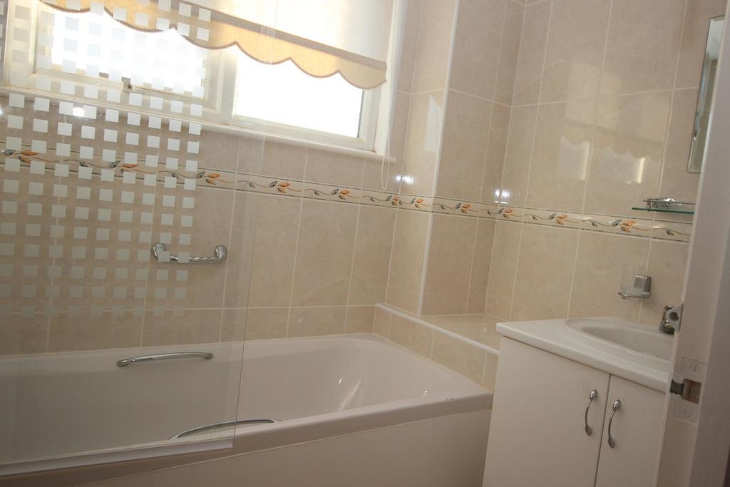 Panelled bath with shower over, vanity wash hand basin, vinyl flooring, electric radiator, window to rear.