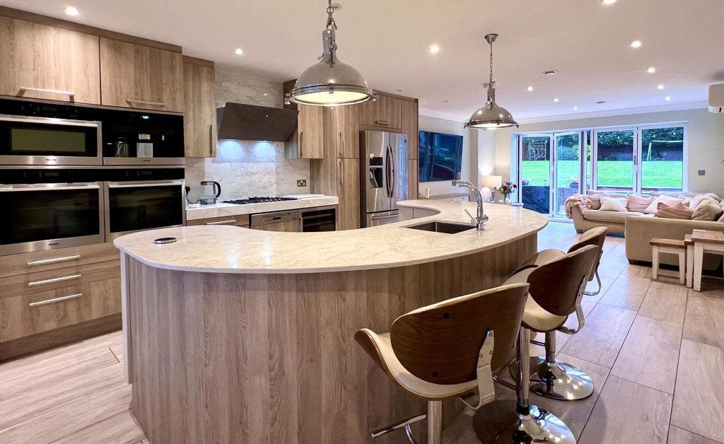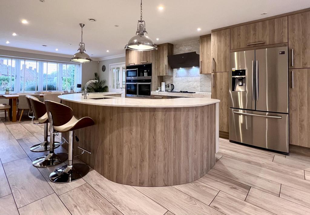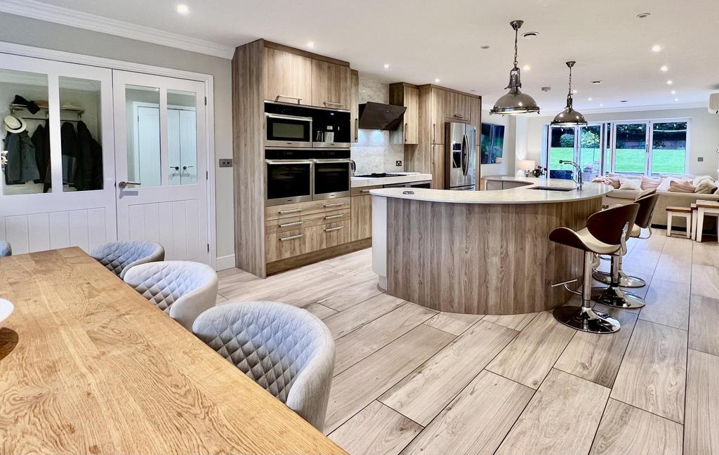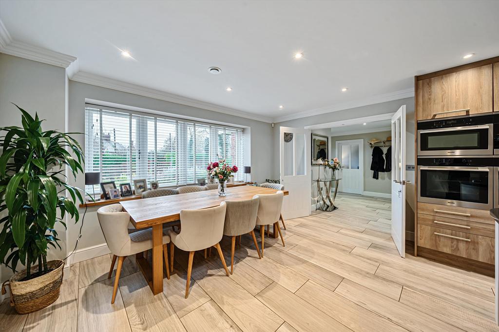 Entering the property via the covered front porch and wide front door, you enter a large entrance hall with porcelain floor tiles and doors accessing the reception rooms. The dual-aspect kitchen with breakfast room and family room is fitted with floor and wall units, and a curved island incorporates seating with industrial-style pendant lighting above. Miele appliances include a dishwasher, three ovens, a gas hob, a wine fridge, and an American-style freezer. The family room opens out on to the rear terrace through bifold doors. A utility room with a sink; the services room and doors lead to both the back garden and the garage to the front.