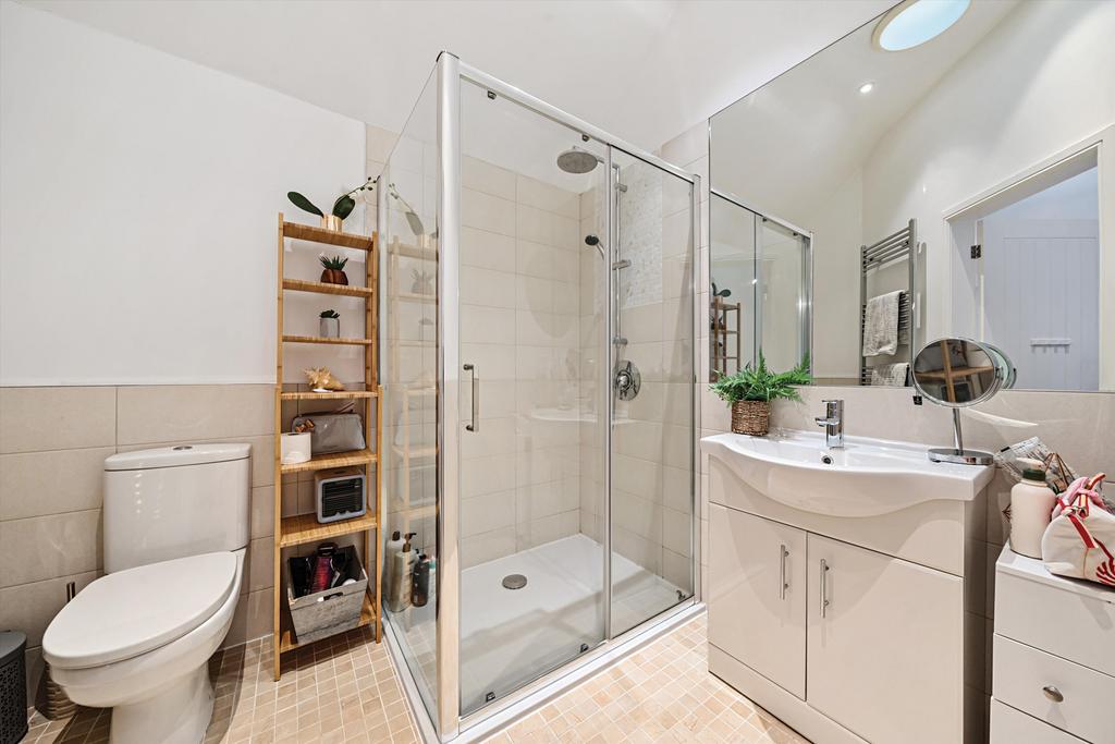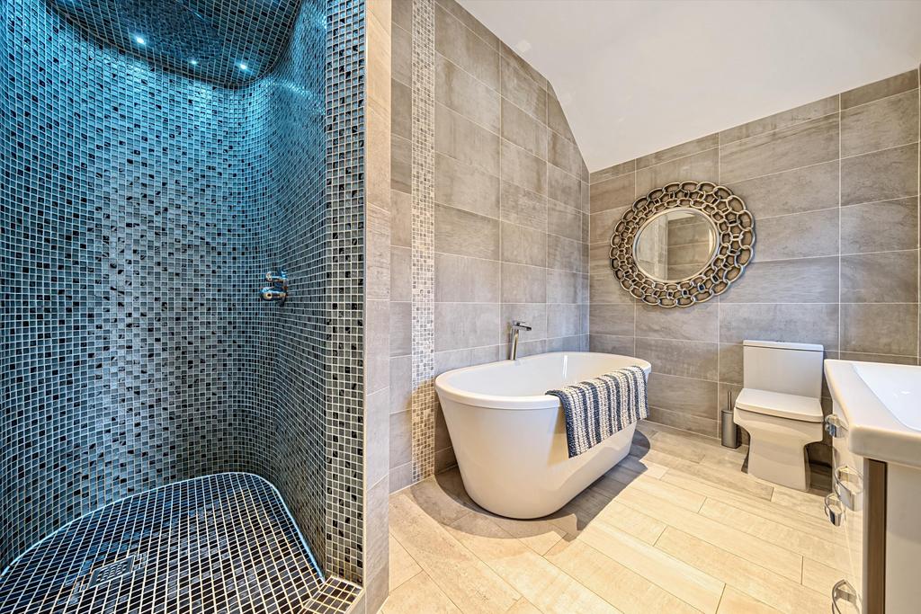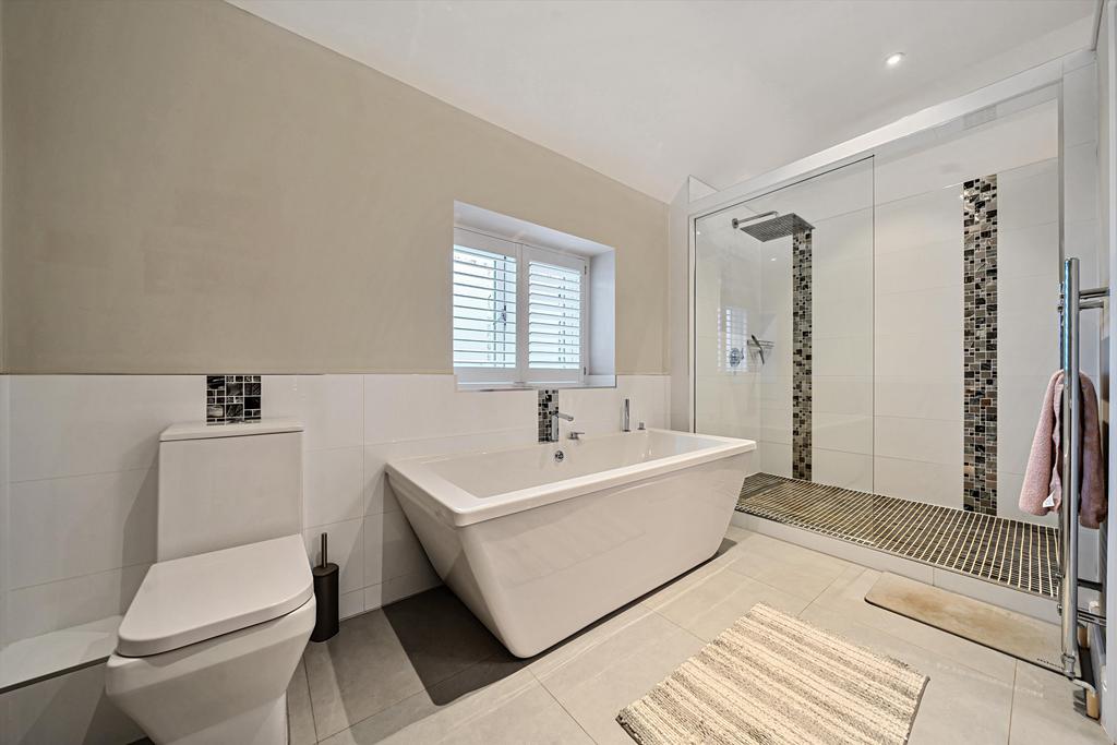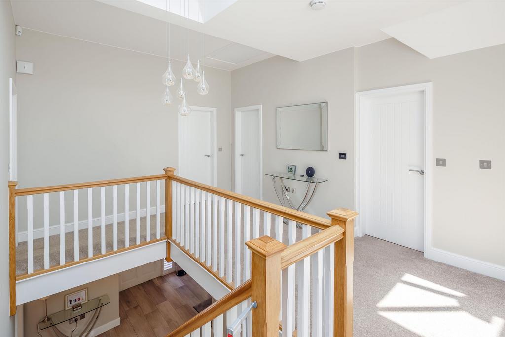 A wide oak galleried staircase leads to the first floor, and a generous landing area with a roof lantern. The spacious, dual-aspect principal suite has a dressing area with built-in storage and an en suite bath and shower room. A guest bedroom has an en suite shower and built-in wardrobe storage. Three further bedrooms and a stunning family bathroom with a bespoke glass mosaic tiled shower complete the accommodation on this floor.