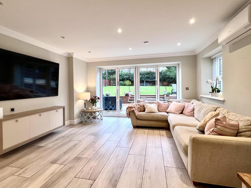 The sitting room has a delightful brick fireplace with an oak mantle, incorporating a gas wood burner stove with bifold doors opening onto the terrace. The entrance hall has a study, a separate reception room/playroom overlooking the front garden, and coat and boot storage.