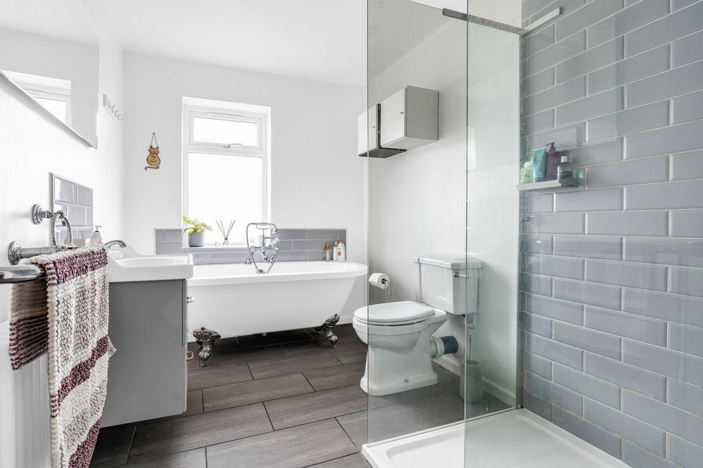 With double glazed window to rear aspect with obscure glass. Fitted with a suite comprising roll top bath, vanity storage unit with inset sink, low level w.c, fully tiled double shower, tiled splash back areas, tiled flooring, heated towel rail.