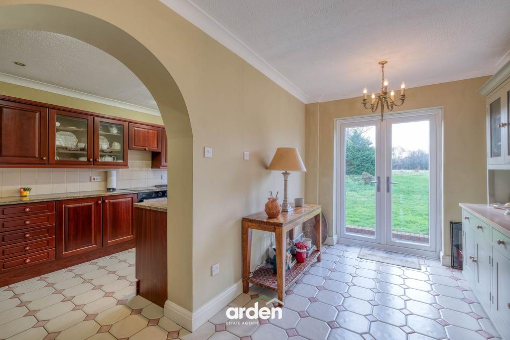 The property welcomes you via a spacious entrance hallway with a guest WC and stairs rising to the first floor. The ground floor offers a generously proportioned lounge featuring a charming fireplace and French doors opening onto the rear garden, complemented by an adjoining open-plan snug. A well-appointed kitchen sits at the heart of the home, accompanied by a separate breakfast room with further French doors to the garden and double doors through to a large formal dining room. Leading off the kitchen and breakfast room is a substantial conservatory that enjoys views across the garden and provides an additional access point outside.