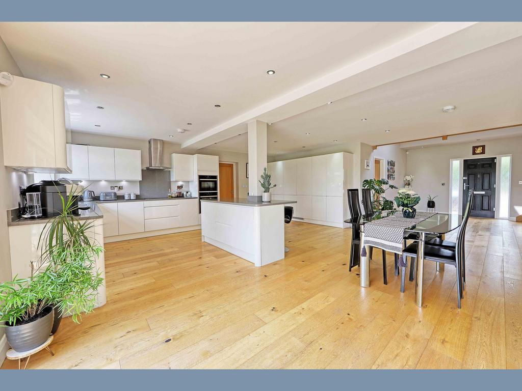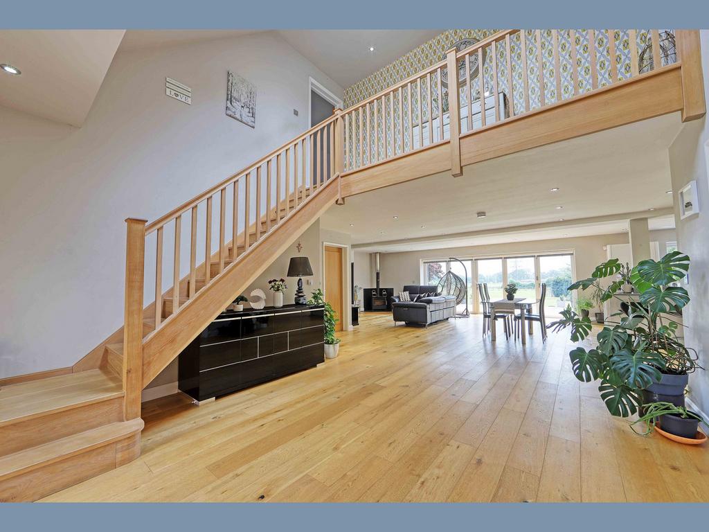 Inside, the vaulted and galleried entrance hall is spectacular and leads into the impressive open-plan living area. The ultra contemporary design is truly unique and offers a beautiful view through the house and out to the rear garden. The living, dining and kitchen areas are all equally spacious, with plenty of versatility too. There is a large utility room to one side which has consent for an extension if a separate reception/playroom is desired.