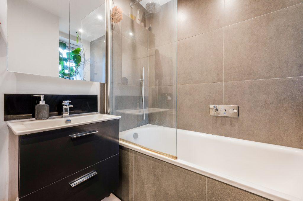 The bathroom is sleek and modern, finished in dark tiling with chrome fixtures. It includes a full-size bath with overhead rainfall shower and glass screen, a contemporary vanity unit with integrated sink, and mirrored cabinet above.