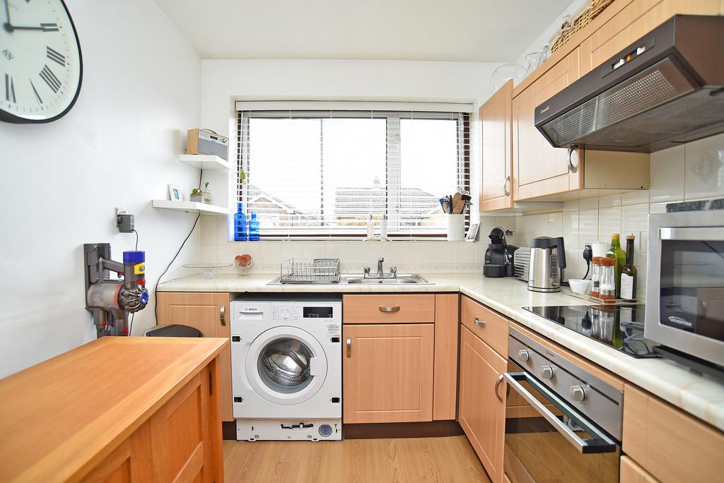 With a range of wall and base units with electric hob and oven. Space and plumbing for a washing machine and fridge. Window to front.