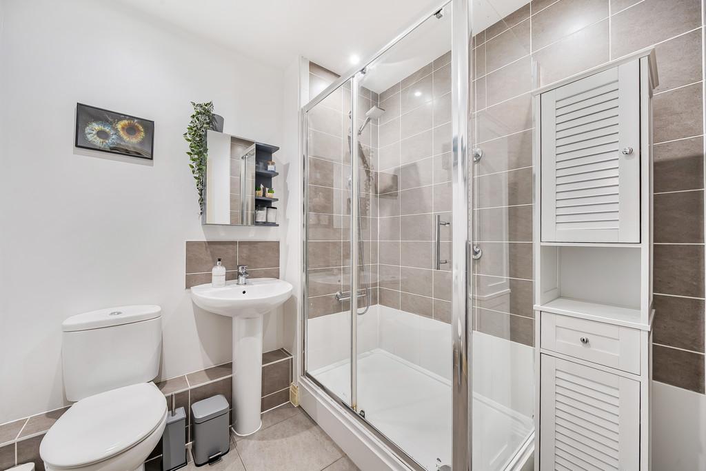 The double bedroom is fitted with built in floor to ceiling wardrobe while the shower room features a large walk in shower and stylish grey tiling.