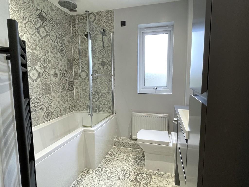 FAMILY BATHROOM Window to rear, P-shaped bath with rainfall shower head and separate shower attachment, low level W.C, hand wash basin inset to vanity unit, built in storage, spotlights, extractor fan, radiator, tiled floor.