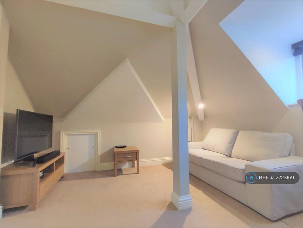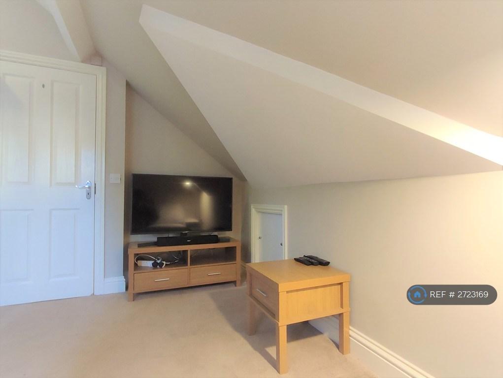 The bedroom offers plenty of storage including a wardrobe, chest of drawers, side cupboard, a desk and chair, and a tall mirror. The flat also has a stylish, fully tiled shower room, central heating, and extra eaves storage areas.