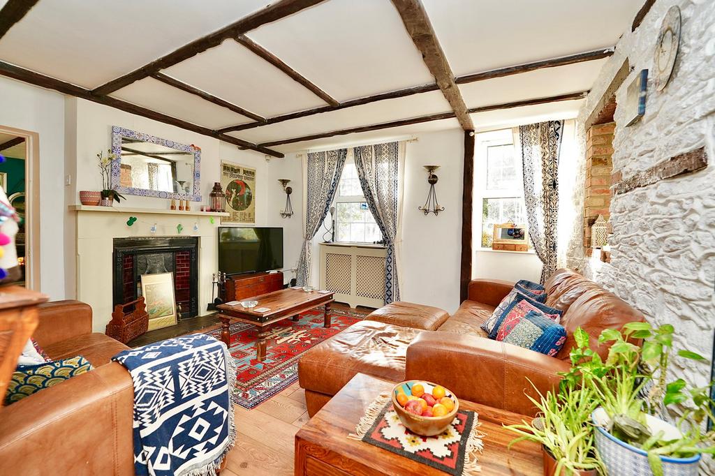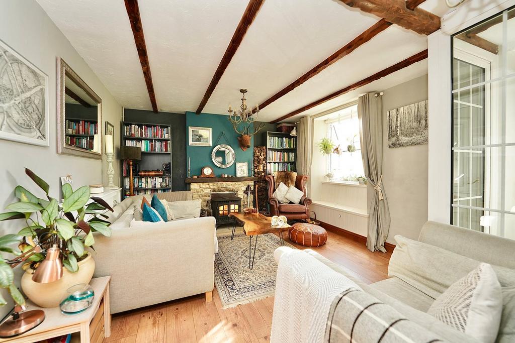 Spacious and light with wood laminate flooring and feature ceiling timbers, stone fireplace with Hunter wood-burning stove for cosy evenings, decorative cover to radiator and charming window seat overlooking the front garden.