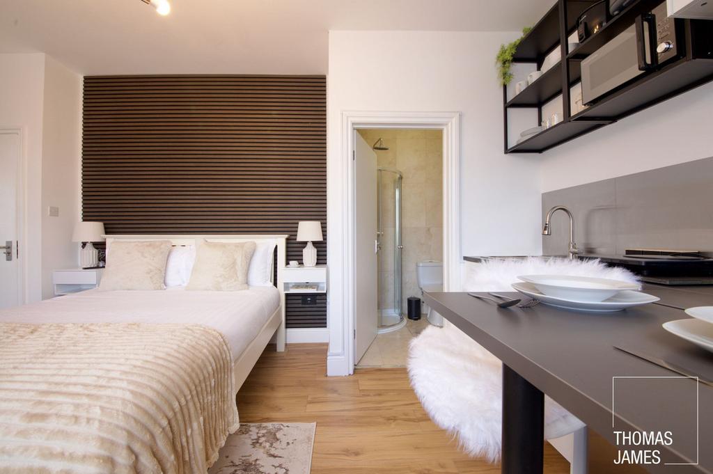 The studio has the appearance of a luxurious hotel room, with white walls, a welcoming wood floor, full length curtains, and contemporary wood wall panel headboard. There’s plenty of storage space in the wardrobe provided, and plenty of room to relax, work, or entertain. The private en suite bathroom has contemporary large-format wall and floor tiles and is fitted with a bath, a washbasin, and a WC.