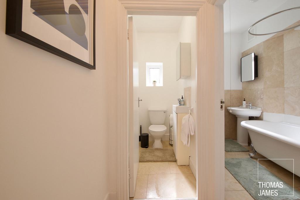 Occupiers of the Whitely Room share bathroom facilities with the adjacent Emerald Room only. These facilities are a large bathroom and a separate WC. The bathroom has contemporary large format wall and floor tiles, a traditional-style freestanding bath (with a mixer shower), washbasin and WC, and a radiator. Both the bathroom and adjacent separate WC have good natural light and ventilation thanks to high-level windows.