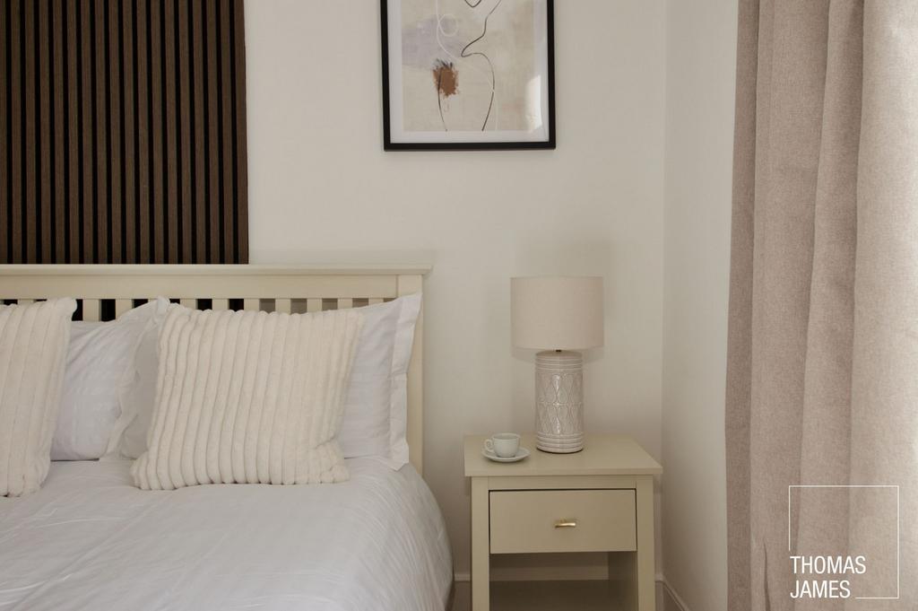 The Whitely Room is a 13 square metre room on the first floor at the quiet rear of the property with good natural light thanks to a south-facing window that overlooks the rear garden. The room easily accommodates the kingsize bed, wardrobe, and chest of drawers provided. The room has and has a calm and relaxing ambience with white walls, a welcoming wood floor, and contemporary wood wall panel headboard, and there’s plenty of storage space in the wardrobe and chest of drawers provided.