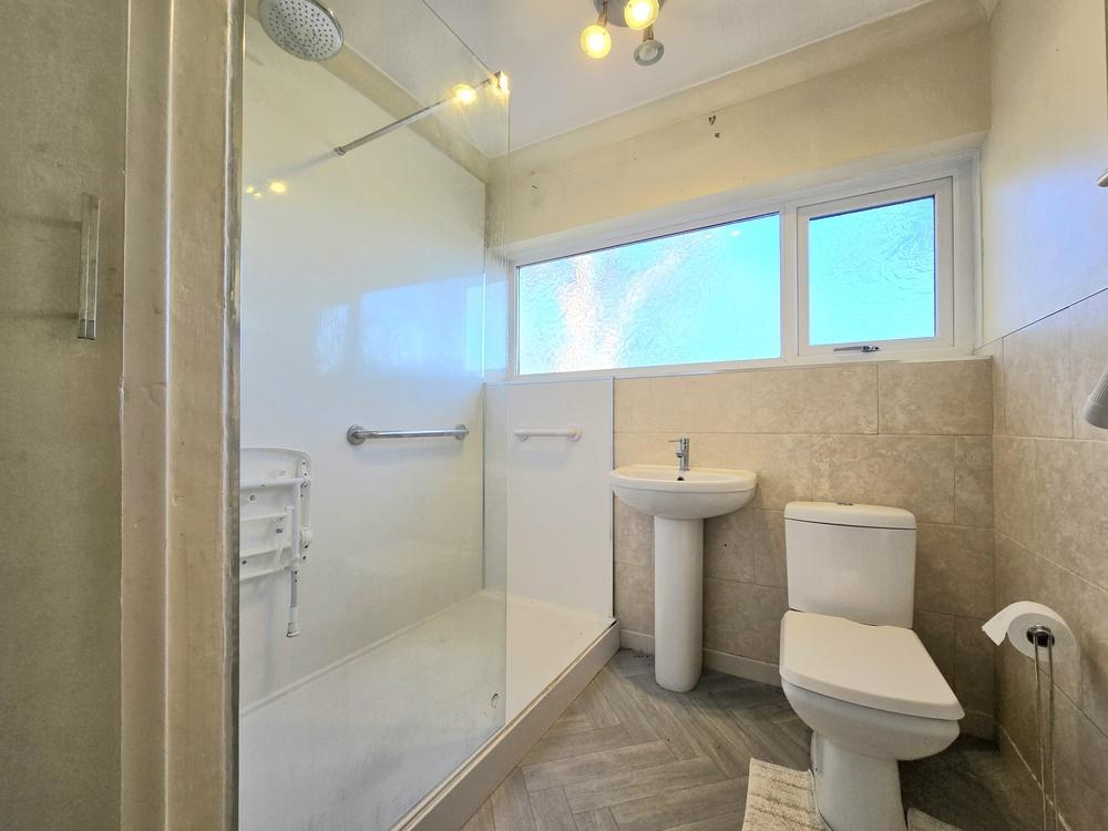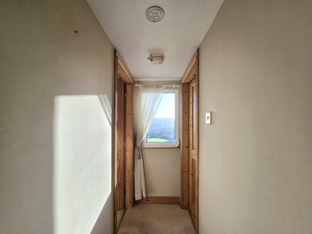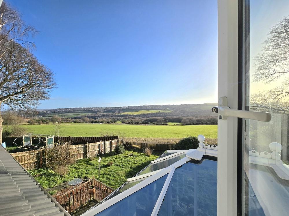 The property is entered via a spacious hallway that leads to a bright and airy living room, with a conservatory to the rear featuring floor-to-ceiling windows that frame the fantastic views and flood the space with natural light, along with a door providing direct access to the outside. The ground floor also offers two large double bedrooms, a family shower room, and a well-proportioned kitchen with additional access to the rear garden.