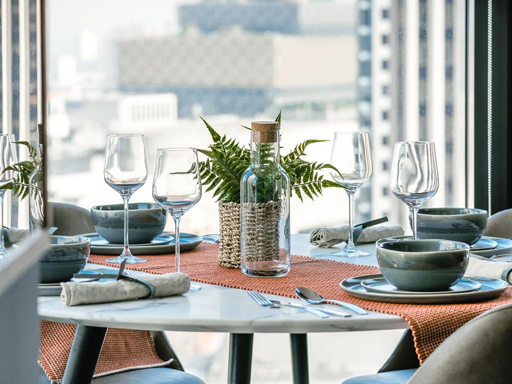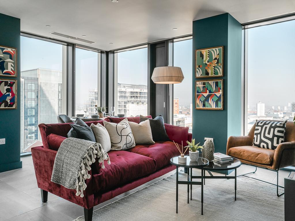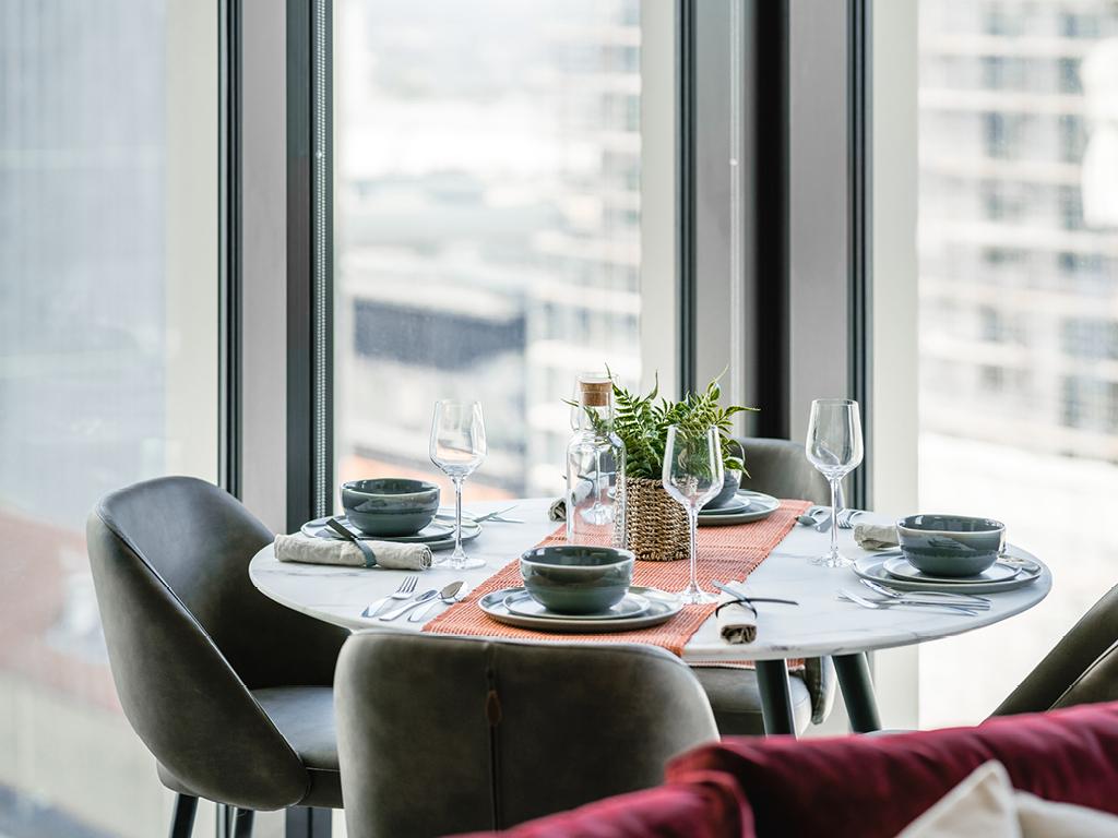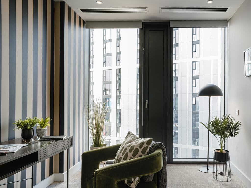 Light and spacious with floor to ceiling windows and blackout blinds. Plush three-seater sofa, lounge chair, media storage unit with 50 inch Samsung smart TV and nested coffee table with mirrored tops.