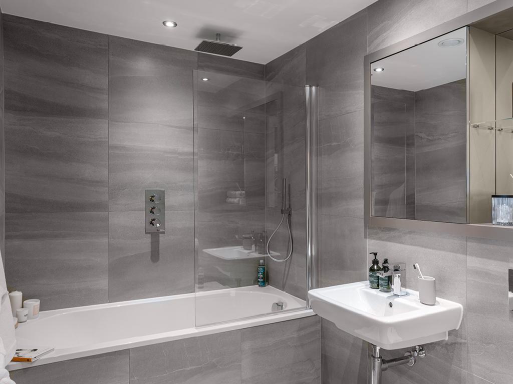 En-suite bathrooms with contemporary porcelain tiling throughout. One with deluxe rainfall shower, the other with bath and rainfall shower, and each with separate handheld shower, WC and heated towel rail, plus bespoke vanity cabinet with LED lighting.