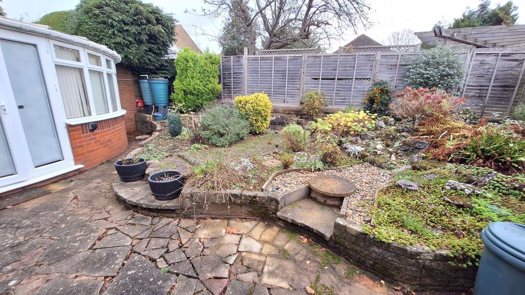 Patio area, leading to landscaped garden with plants, flowers and bushes, enclosed by timber fence boundary.