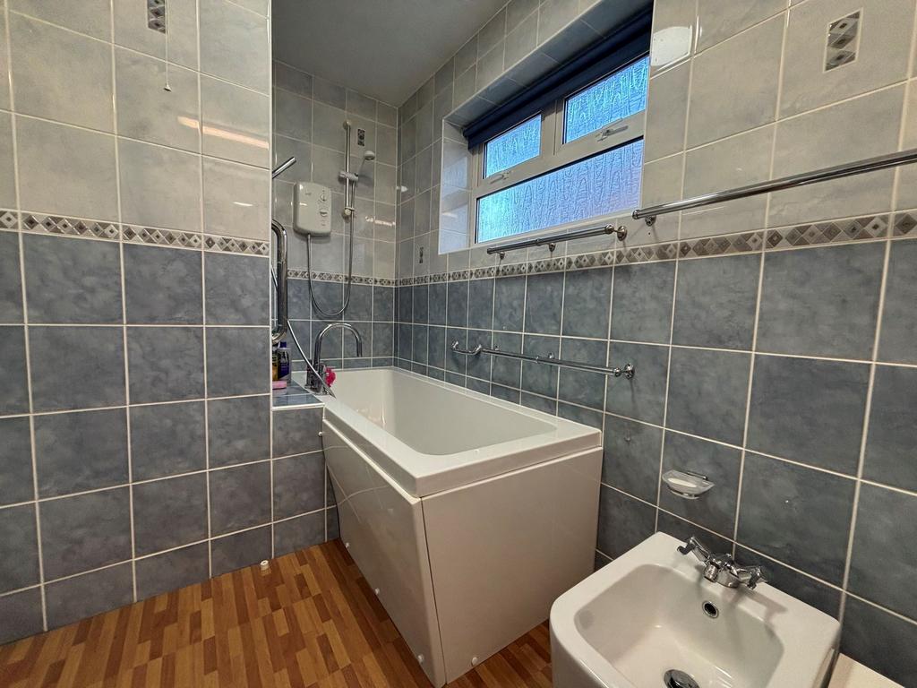 Opaque double glazed windows to side, panelled bath with electric shower, low level W.C, wash hand basin, bidet, heated towel rail, radiator.
