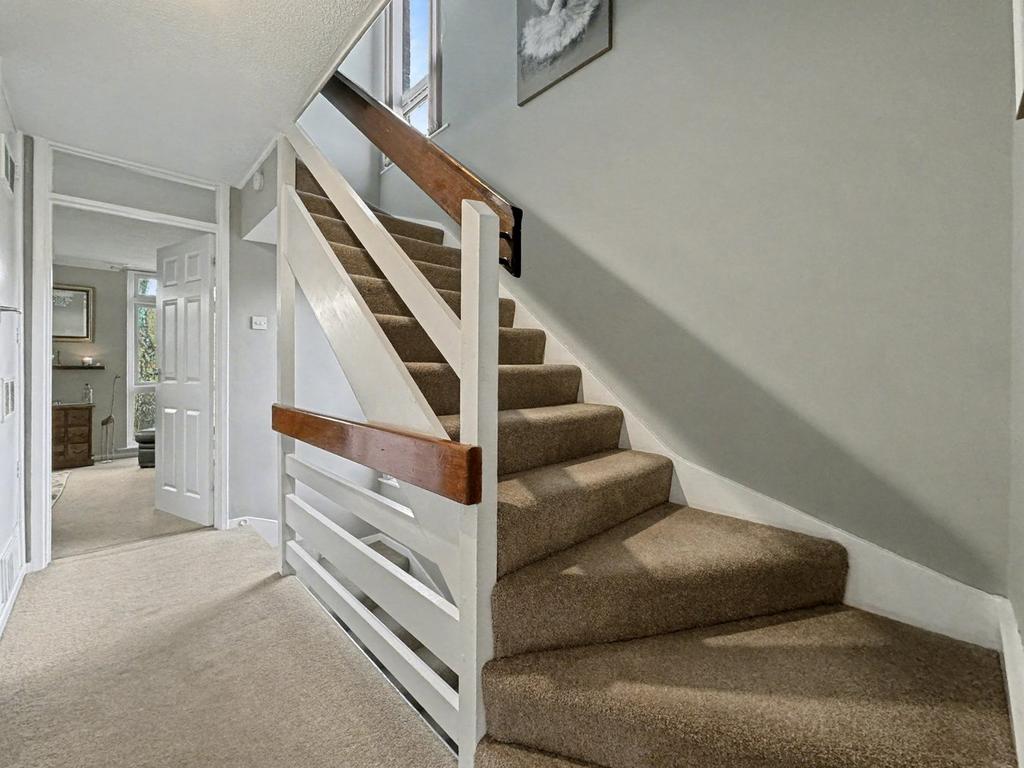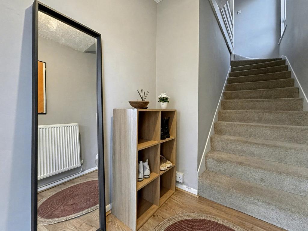 A bright and welcoming entrance hallway sets the tone for the home, offering a generous area for coat and shoe storage while leading seamlessly upstairs to the main living spaces. Neutral décor ensures a stylish and move-in ready foundation.