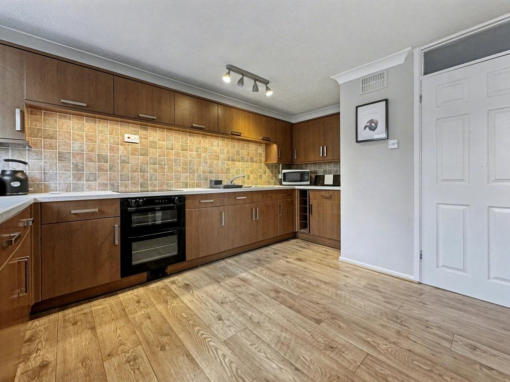 The expansive kitchen-diner runs the full depth of the property, creating a sociable and highly functional space. With extensive worktop areas, plentiful cabinetry, built-in oven, hob and extractor, and space for appliances, the kitchen is perfect for those who love to cook or entertain. Large windows flood the room with light and frame views across the greenery, making everyday dining feel relaxed and inviting. This room has the potential to become a fantastic family hub — ideal for hosting gatherings, adding an island or even creating a cosy second seating area.