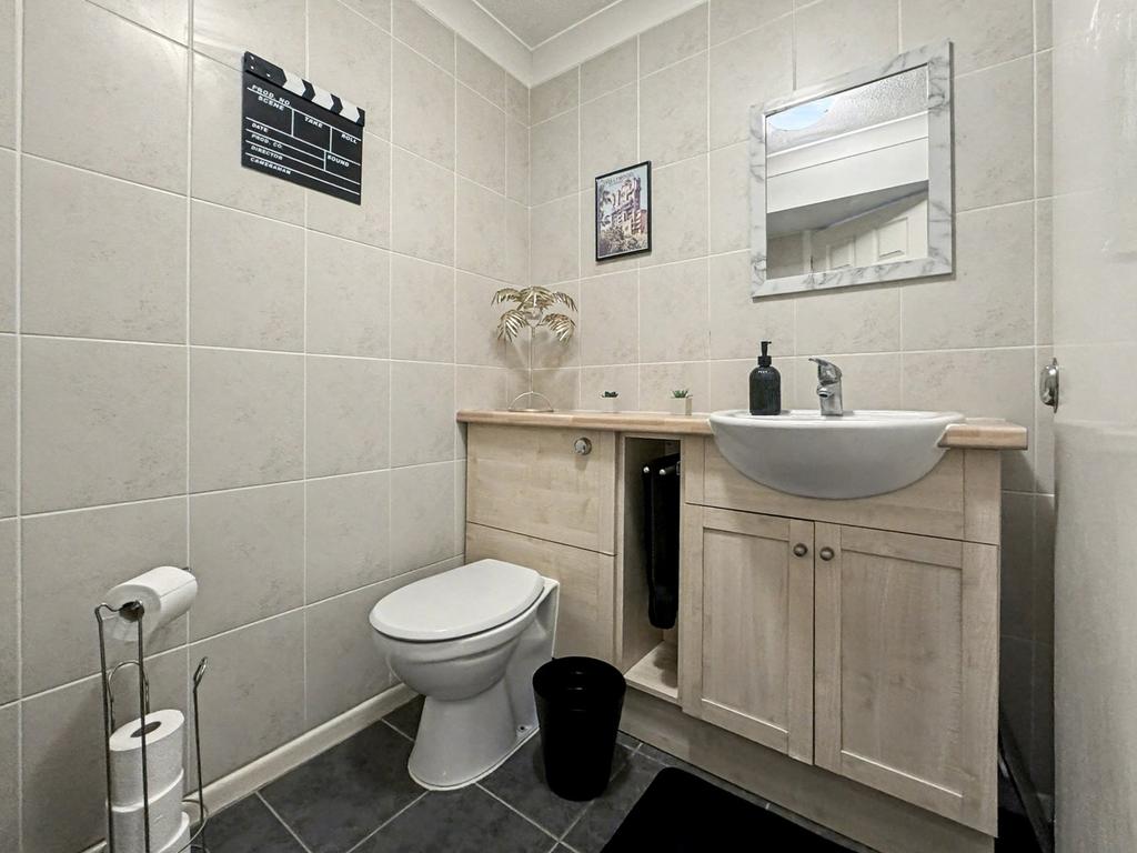 A well-appointed cloakroom finished with modern tiling, built-in storage and a contemporary wash basin. A practical addition for guests and families, with potential to update or personalise to suit your style. With the built-in storage space, there is potential to consider adding in a shower.