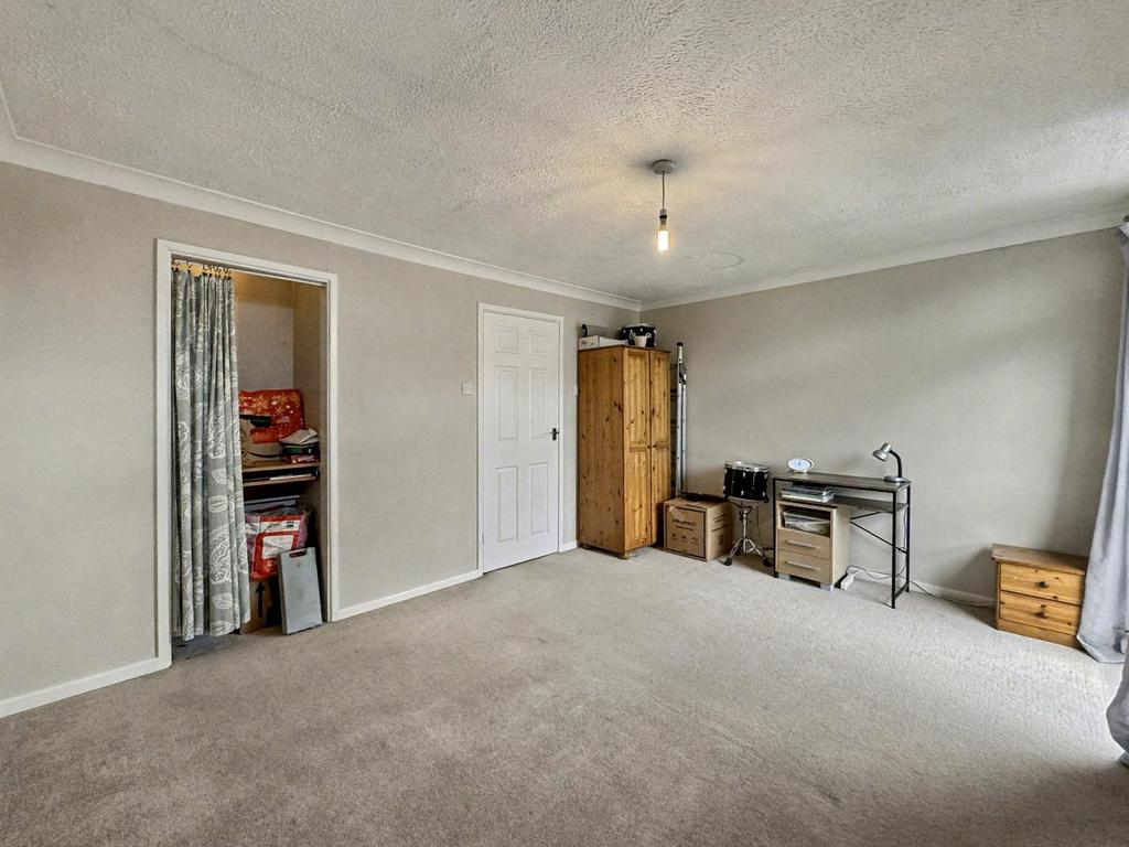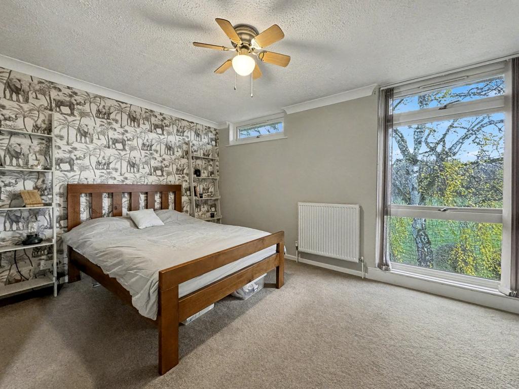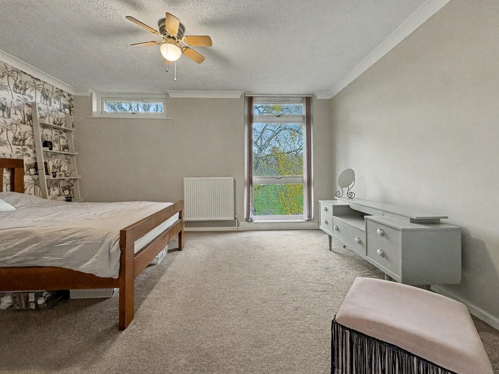 A spacious and airy primary bedroom with a striking feature wall, built-in storage areas and dual-aspect windows capturing open views. The room easily accommodates a king-size bed and additional furnishings, with potential to add wardrobes, a dressing area or personalised décor touches.