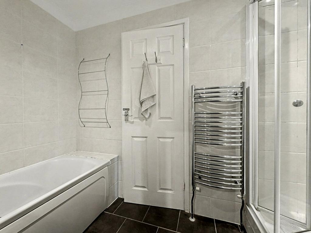A modern, neutrally tiled bathroom complete with WC, wash basin, and full-size bath with overhead shower. This spacious, clean and functional room has plenty of potential for creating a spa-like retreat with simple updates or accessories.
