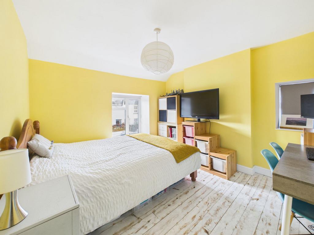 A bright and uplifting space the second bedroom has cheerful décor and a pleasantly open feel. A wide window draws in plenty of natural light, giving the room a fresh, airy atmosphere throughout the day and offering a pleasant outlook towards the surrounding homes and gardens. Well proportioned, the room easily accommodates a double bed with room to spare for additional furniture such as wardrobes, shelving, or a desk. As shown, it also lends itself well to a combination of sleeping and study space, making it ideal for older children, teenagers, or as a generous guest room.The light-painted floorboards add character and complement the sunny tones of the walls, creating a warm and welcoming environment. Overall, it’s a versatile room with a comfortable layout, suitable for a range of uses depending on the needs of the household.