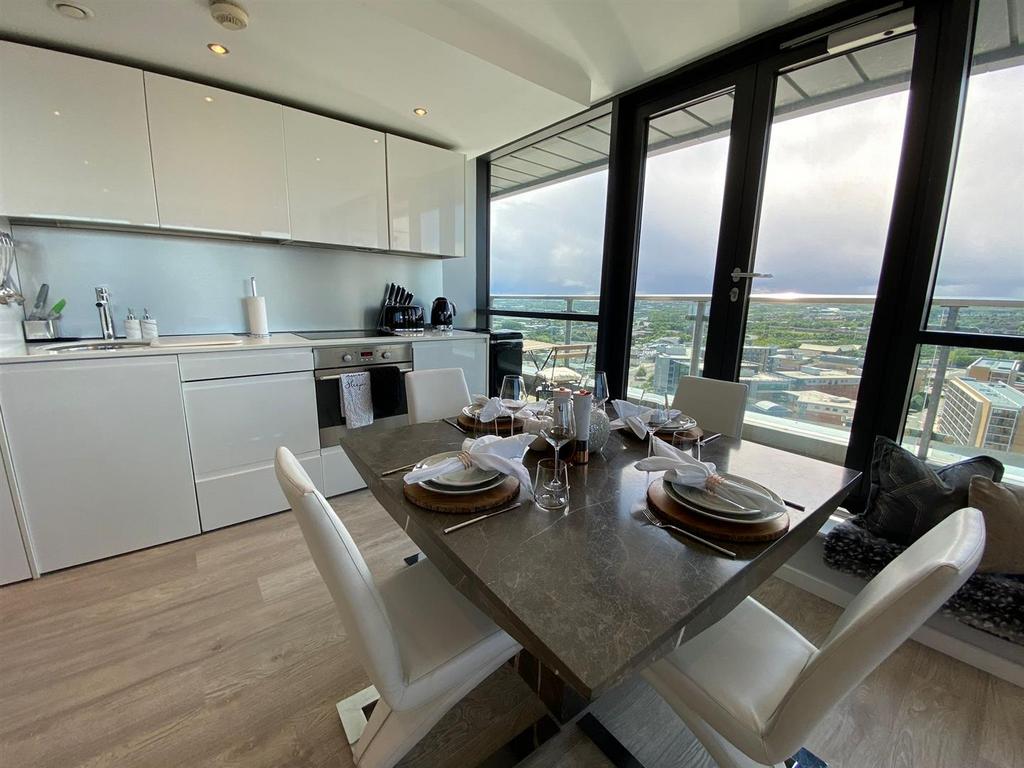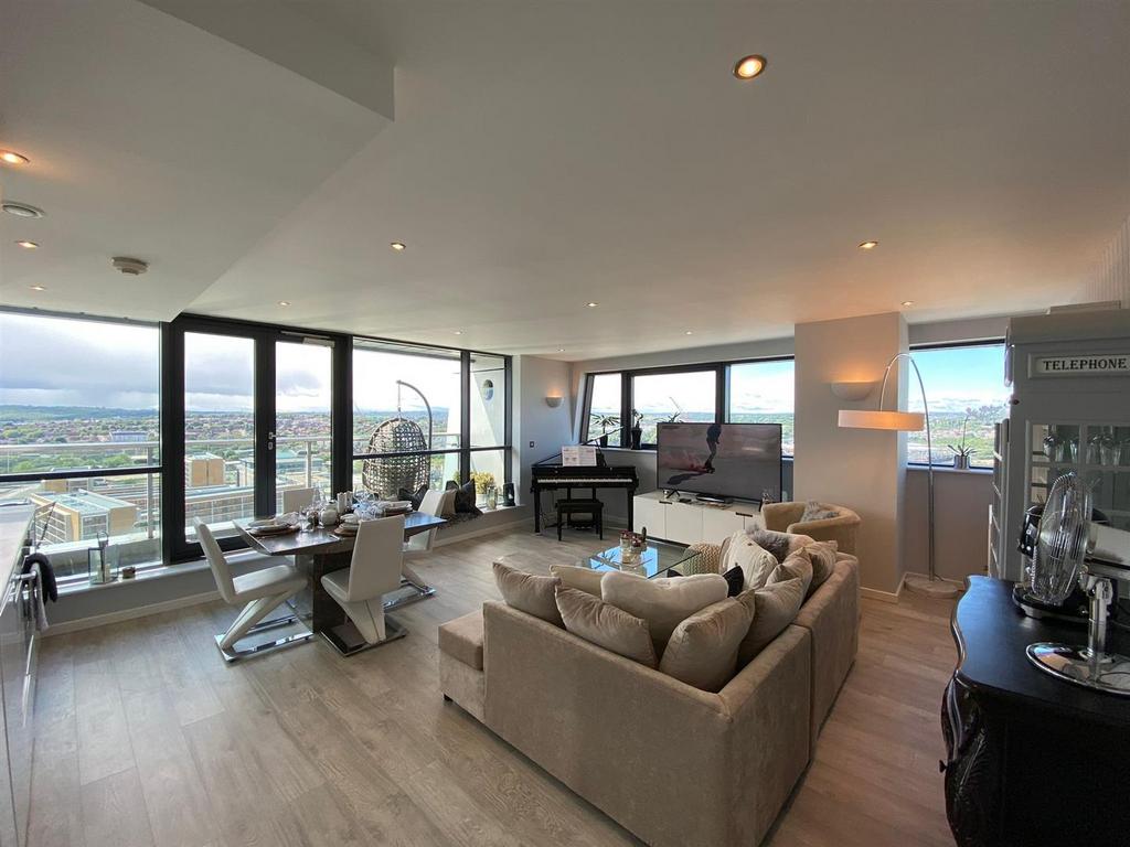 Kitchen/Living/Diner - Accessed from the hallway, this exceptional open-plan living space must be viewed in person to fully appreciate its scale and atmosphere. The bright and airy room is framed by floor-to-ceiling, wall-to-wall windows, flooding the space with natural light and providing uninterrupted panoramic views across the city centre and beyond.