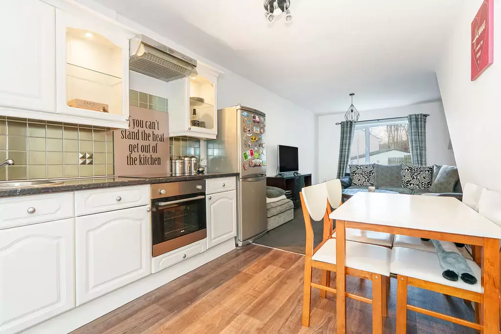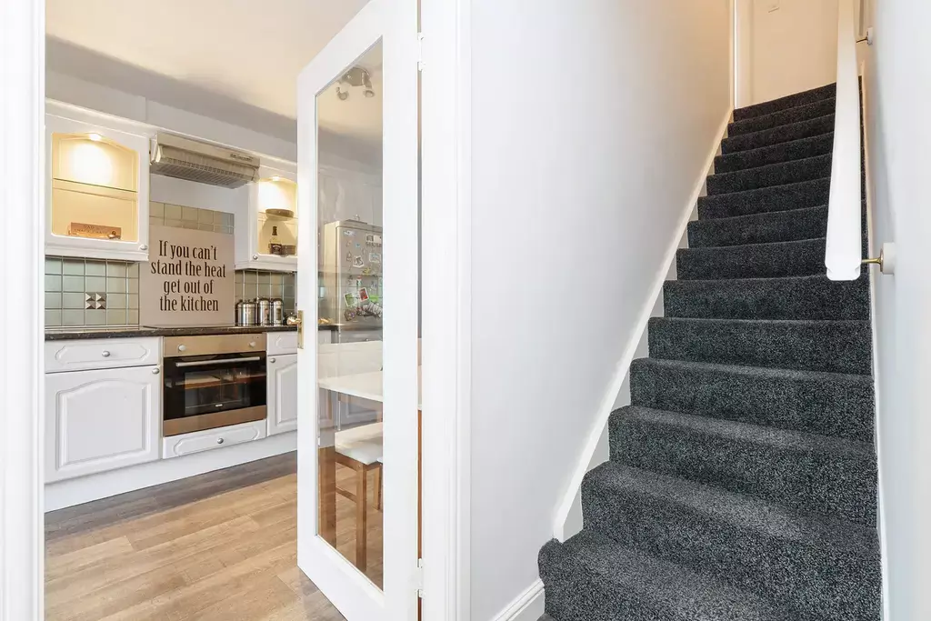 The welcoming entrance hallway leads to a cloakroom (WC), a comfortable living room, and a modern dining kitchen with direct access to the attractive landscaped rear garden. The first floor provides three bedrooms and a family bathroom.
