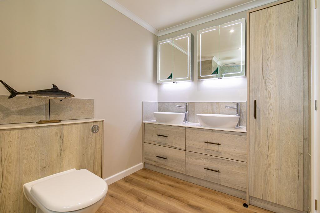 This beautifully appointed home boasts a bright and spacious open-plan living area, enhanced by floor-to-ceiling windows, remote-operated roof lights, and bi-fold doors that seamlessly blend indoor and outdoor living. The generous layout comfortably accommodates a lounge and dining area, creating a warm and versatile central hub, perfect for both relaxing and entertaining. The contemporary kitchen is a true highlight, featuring stylish cabinetry, sleek worktops, and a central island with breakfast bar, ideal for casual dining. A full suite of integrated appliances includes an electric oven, microwave, hob with downdraft extractor, fridge-freezer, dishwasher, and wine cooler. The washing machine is thoughtfully housed in the separate cloakroom for added convenience.