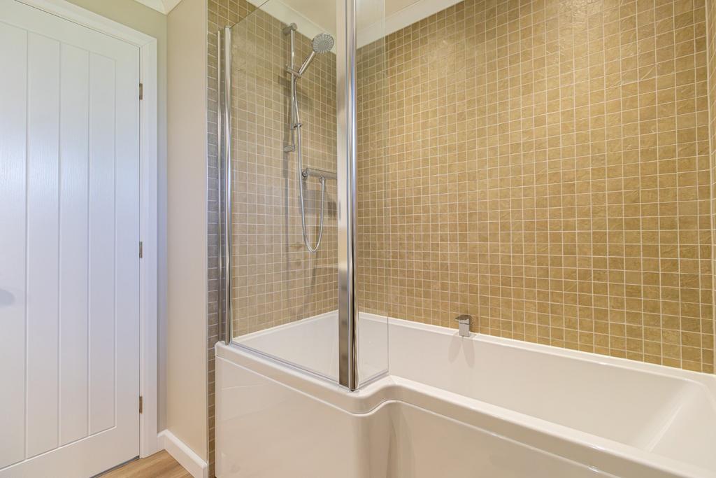 The bedrooms are arranged off the central hallway, offering both privacy and comfort. The impressive master bedroom features built-in wardrobes, a dressing table, and the luxury of a spacious ensuite shower room, which includes a large walk-in shower, WC, a vanity unit with twin wash basins, and heated towel rail. Bedroom two is a comfortable double room with a built-in wardrobe, while bedroom three is a smaller single room, currently furnished with bunk beds. These rooms are served by a stylish family bathroom, complete with a bath with shower over, heated towel rail, and a modern vanity unit with wash basin and WC.