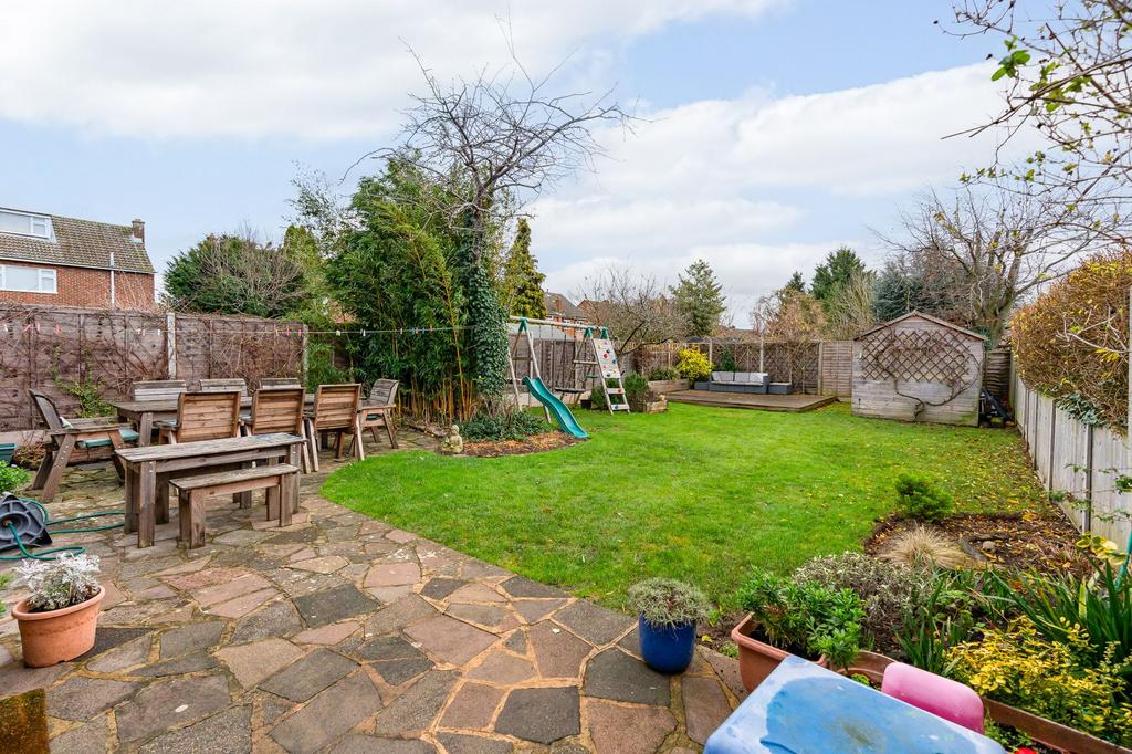 The sizeable rear garden features a patio seating area which in turn leads to the lawn with mature beds and a further decked seating area to the rear of the garden together with a timber garden shed.