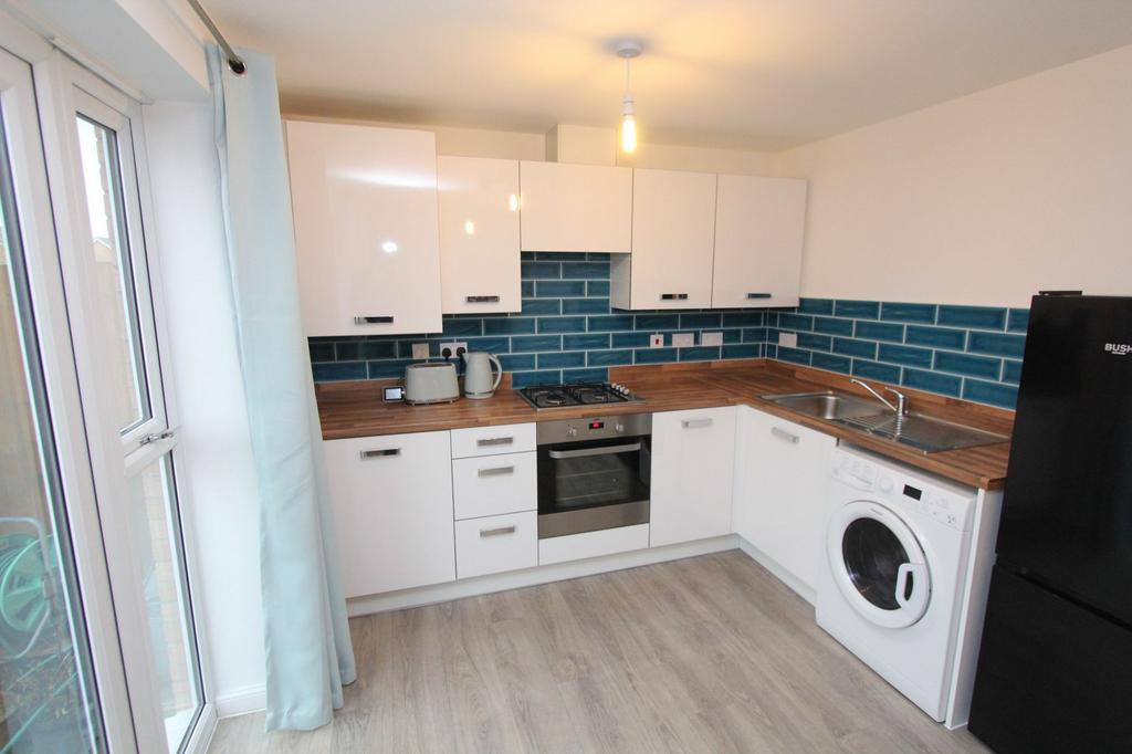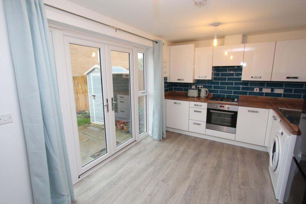 UPVC French doors to rear. Radiator. Under stairs cupboard. Fully fitted kitchen comprising eye level units base units with drawers and work surfaces over. Inset stainless steel sink with mixer tap. Integrated gas hob with oven. Wall mounted combination boiler providing the central heat and hot water. Space for white goods. Partially tiled walls.