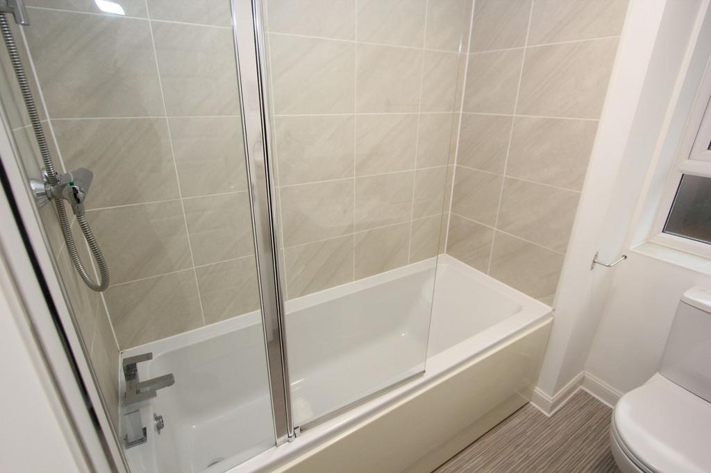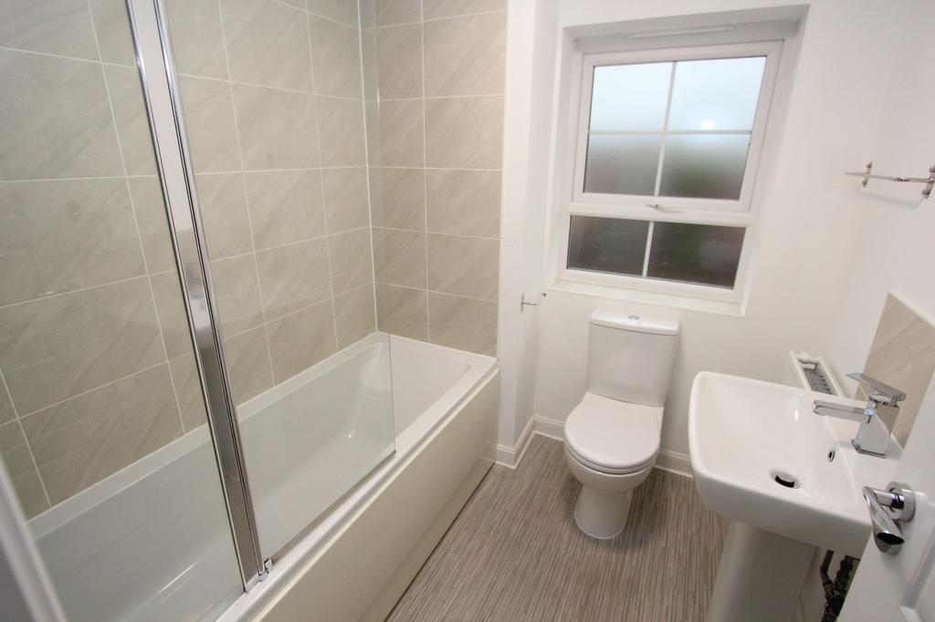 UPVC opaque window to rear. Low level WC. Pedestal wash hand basin with mixer tap. Panelled bath with mixer shower over. Radiator.
