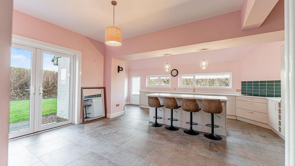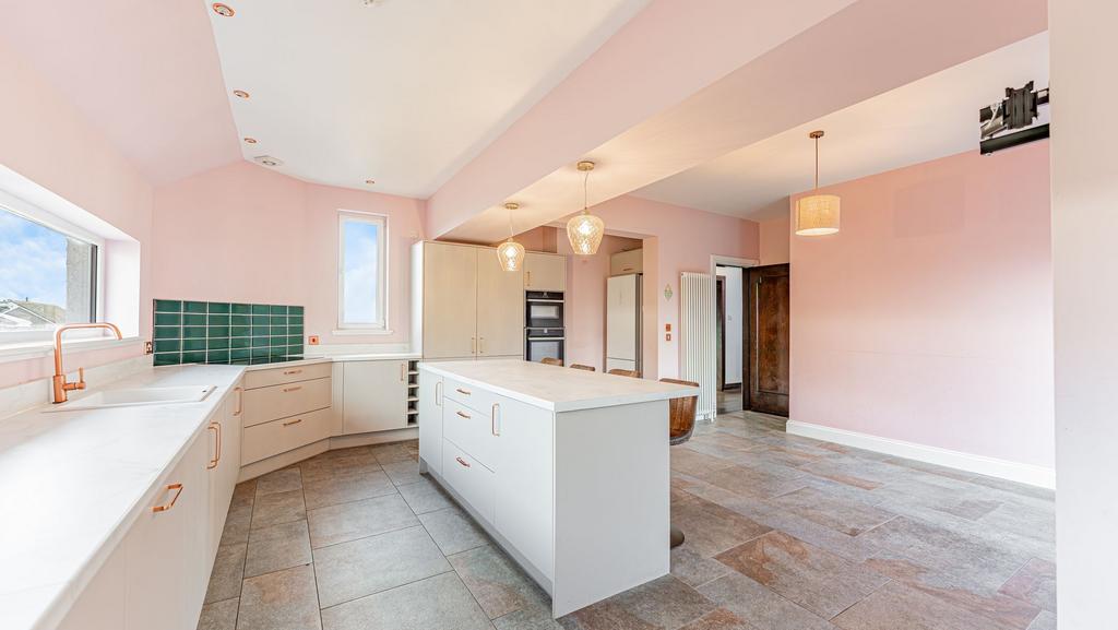 The attached photographs and video provide a sense of scale and layout, but in summary the accommodation begins with an entrance porch leading into a welcoming reception hallway with a generous cloakroom. The formal living room features an oriel window, while the contemporary dining kitchen includes grey cabinetry, a centre island with breakfast bar, and integrated appliances such as a microwave, oven, induction hob, dishwasher, washing machine and tumble dryer. French doors open directly from the kitchen into the rear garden. Also accessed from the hallway is a good-sized bedroom and a beautiful bay-windowed dining room with an original press cupboard and open views.